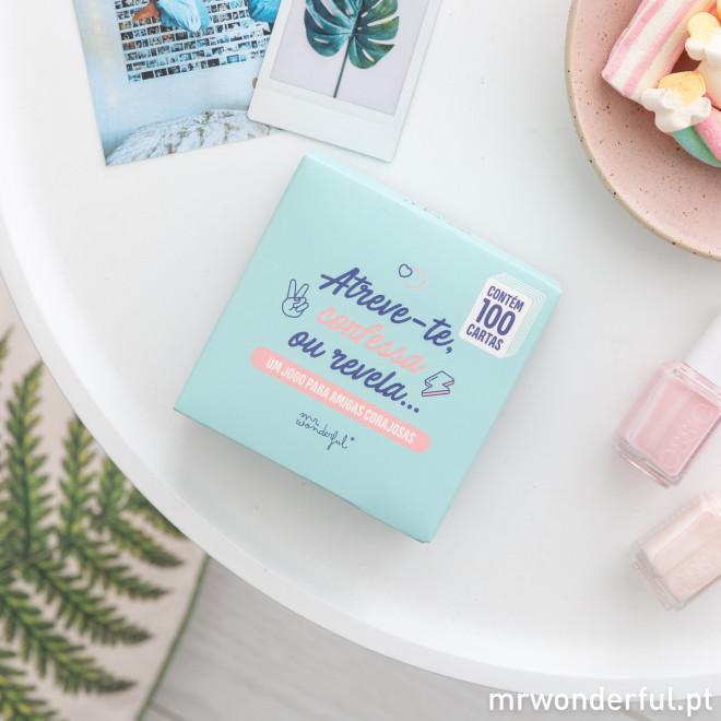 Jogo de 100 cartas com temática de amizade. O objetivo do jogo é que as amigas cumpram desafios, respondam perguntas incómodas ou façam confissões à medida que as cartas saem. Inclui instruções.